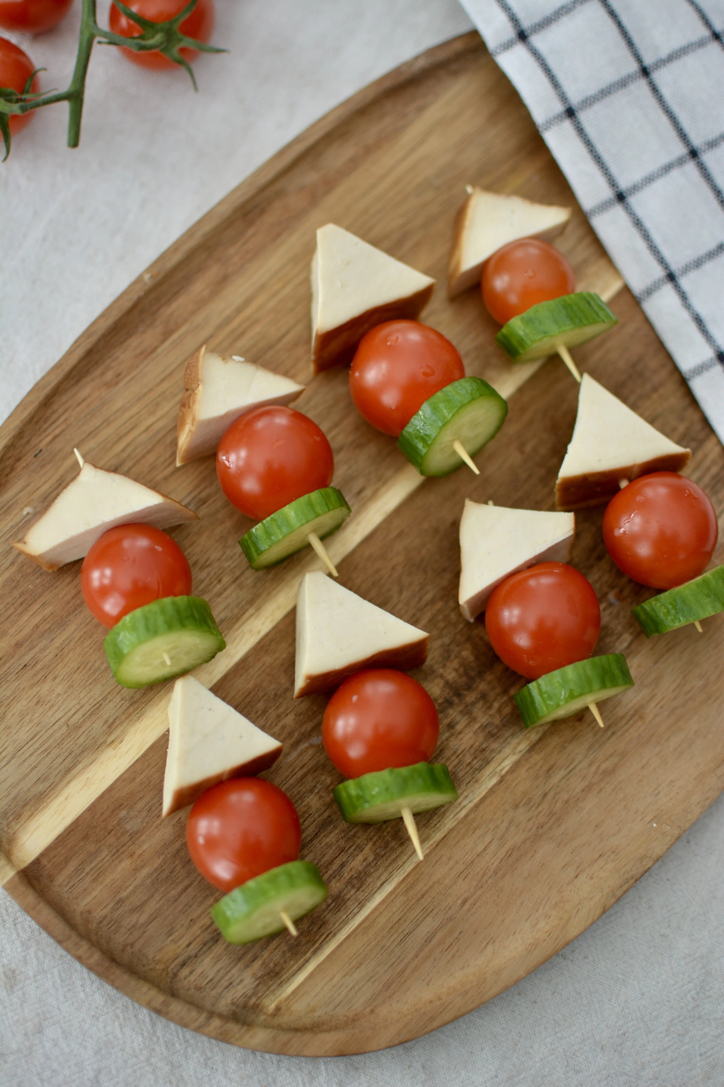 2. Piquer un morceau de tofu fumé, une tomate cerise et une tranche de concombre sur un cure-dent.