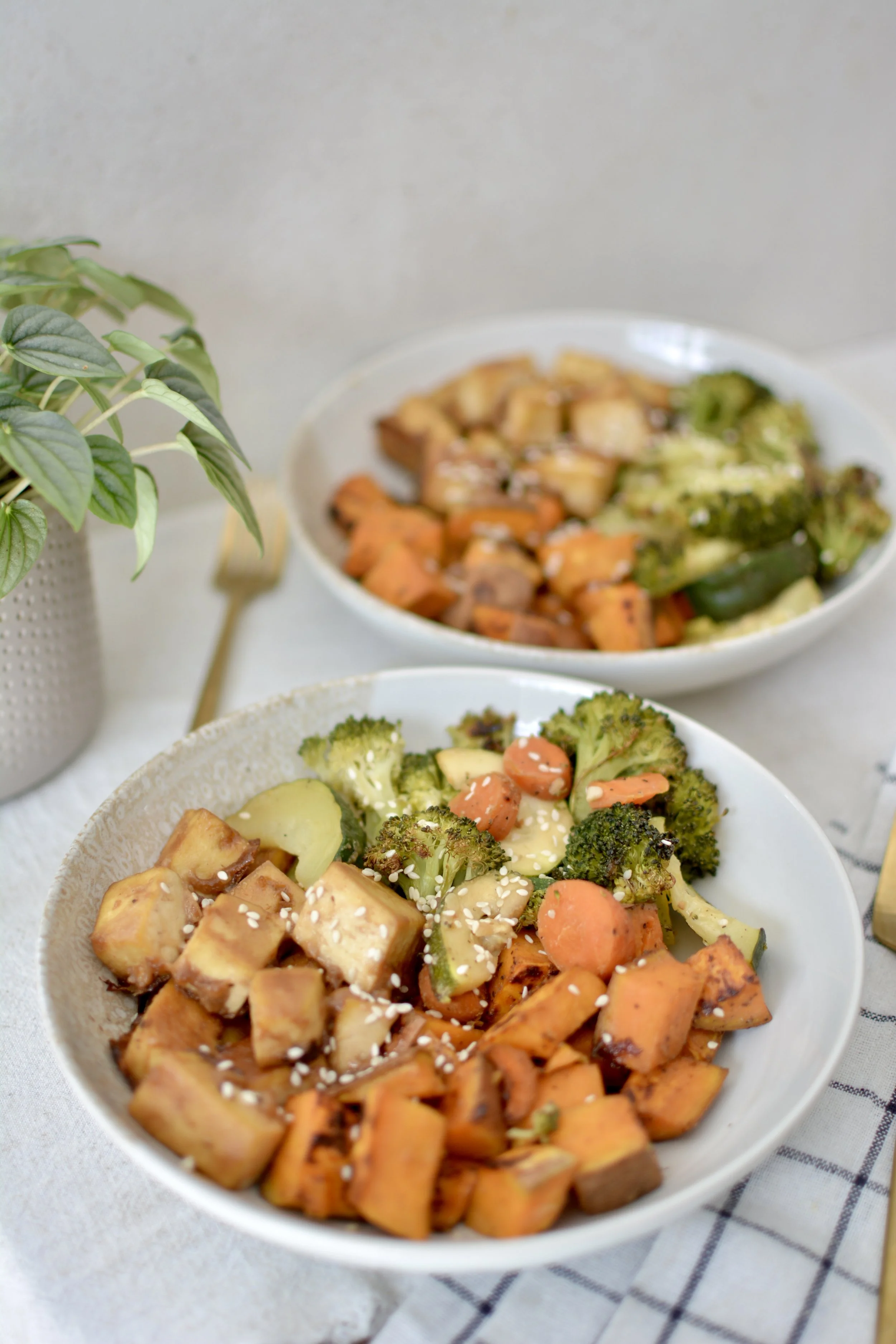 Plaque de tofu épicé à l’érable, patate douce et légumes rôtis