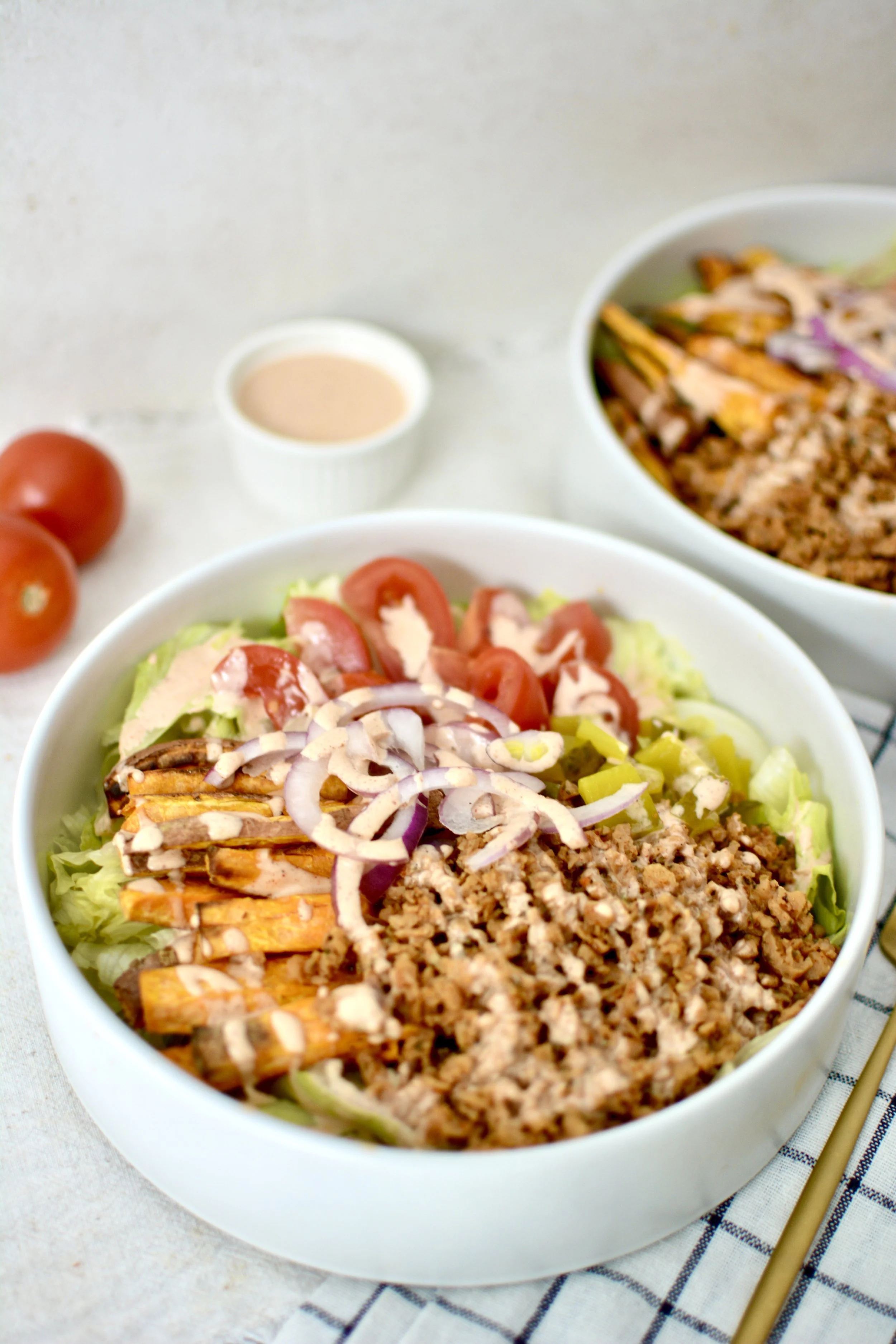 Un bol burger végétalien, riche en saveurs et en textures, où la PVT bien assaisonnée remplace la viande hachée à merveille. Nourrissant, protéiné et parfait pour un repas simple, rapide et gourmand, sans compromis sur le goût!